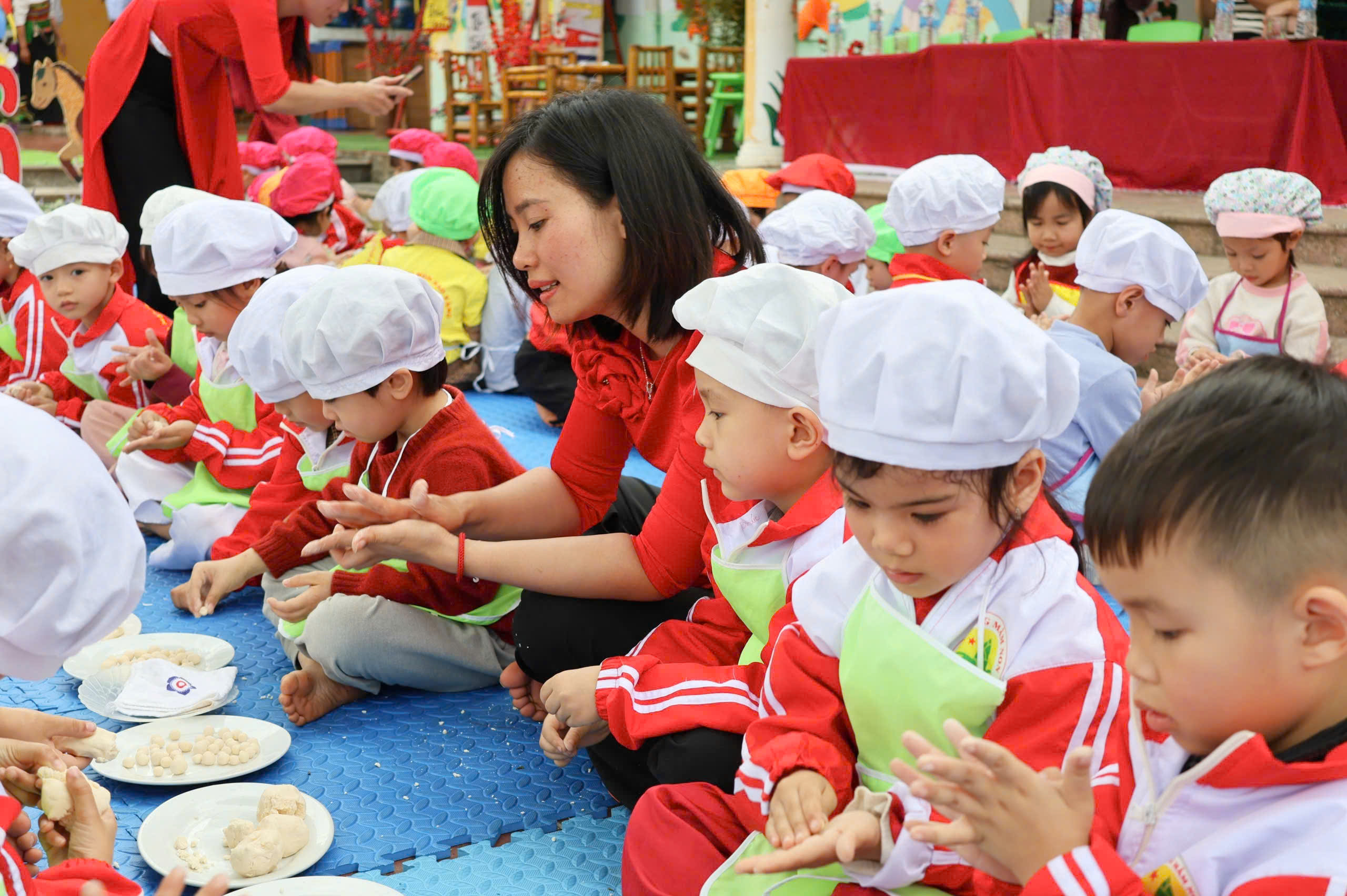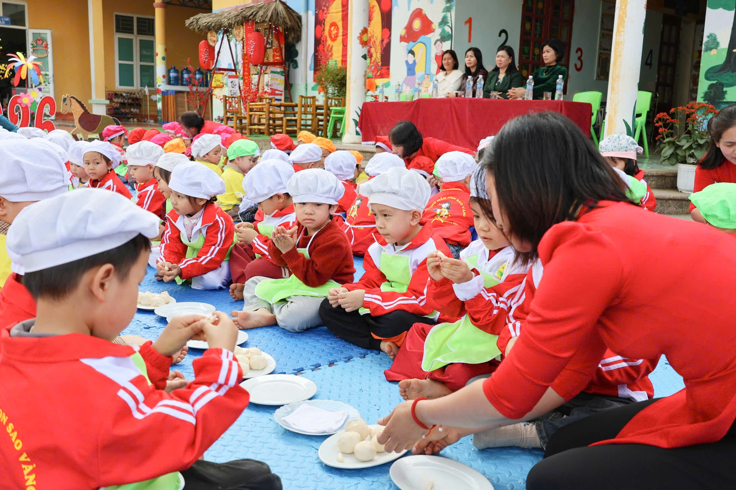 Tiếp nối những nỗ lực đó, nhân dịp Tết Nguyên đán Bính Ngọ 2026, trường Mầm non Sao Vàng đã tổ chức chuỗi hoạt động trải nghiệm phong phú, đa dạng như: giao lưu văn nghệ, trình diễn thời trang, tham gia các trò chơi dân gian, đặc biệt là hoạt động trải nghiệm làm bánh nhãn, cuốn nem…